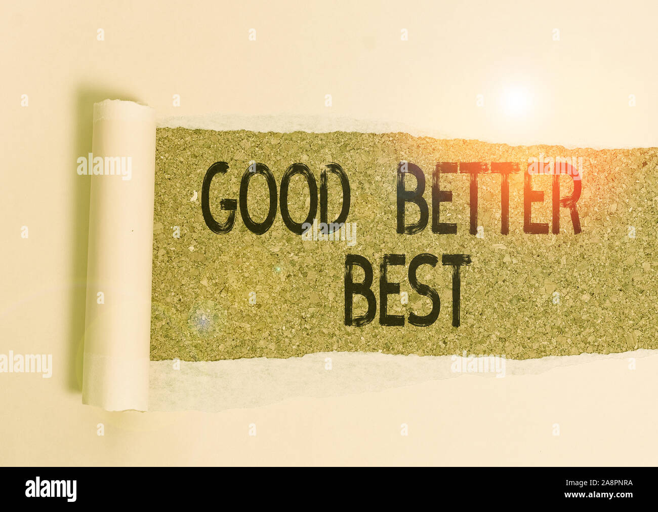 Conceptual Hand Writing Showing Good Better Best Concept Meaning Increase Quality Improvement Achievement Excellence Cardboard Which Is Torn Placed A Stock Photo Alamy