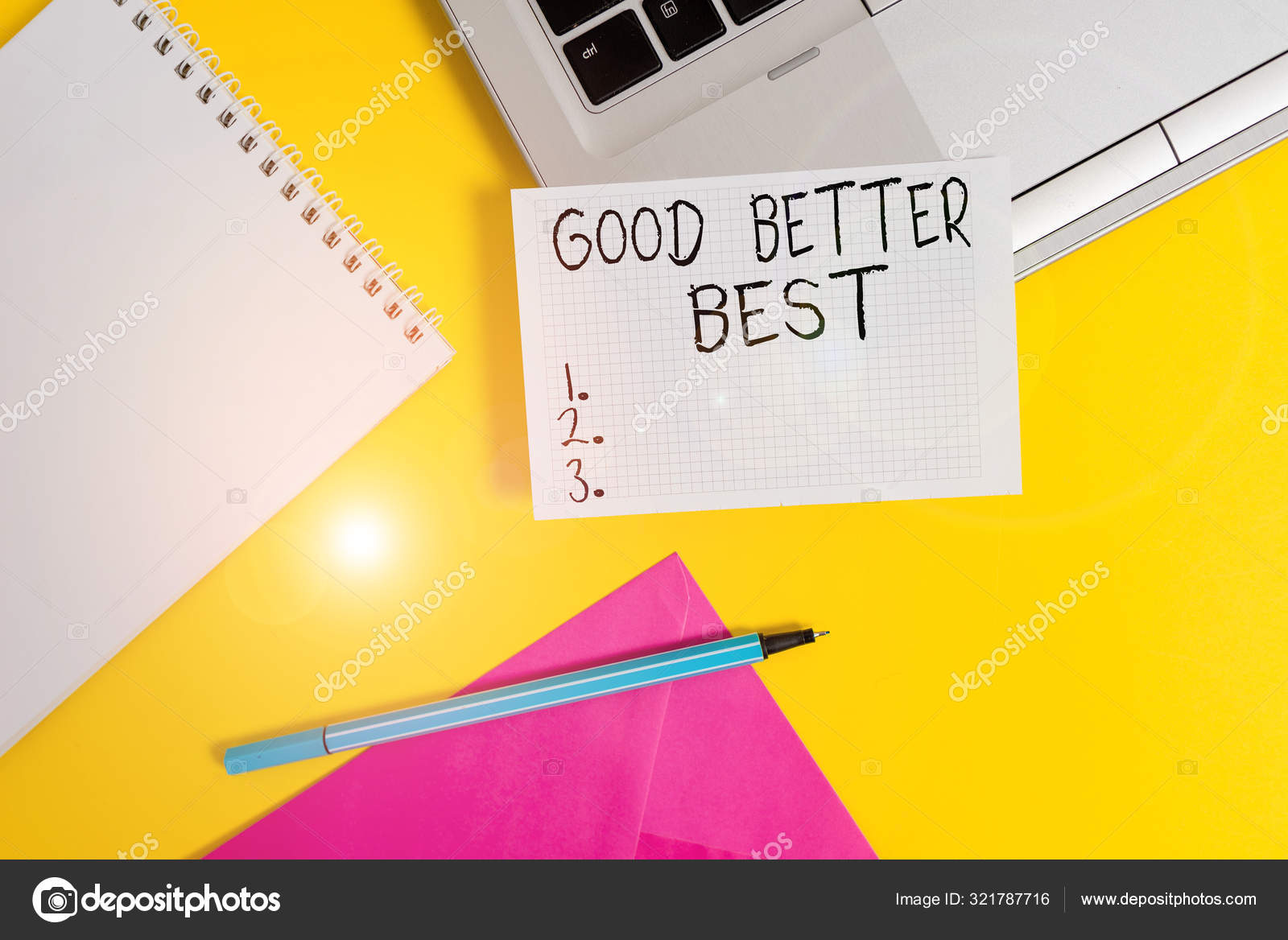 Conceptual Hand Writing Showing Good Better Best Business Photo Showcasing Increase Quality Improvement Achievement Excellence Laptop Marker Square Sheet Spiral Notebook Color Background Stock Photo By C Artursz 321787716
